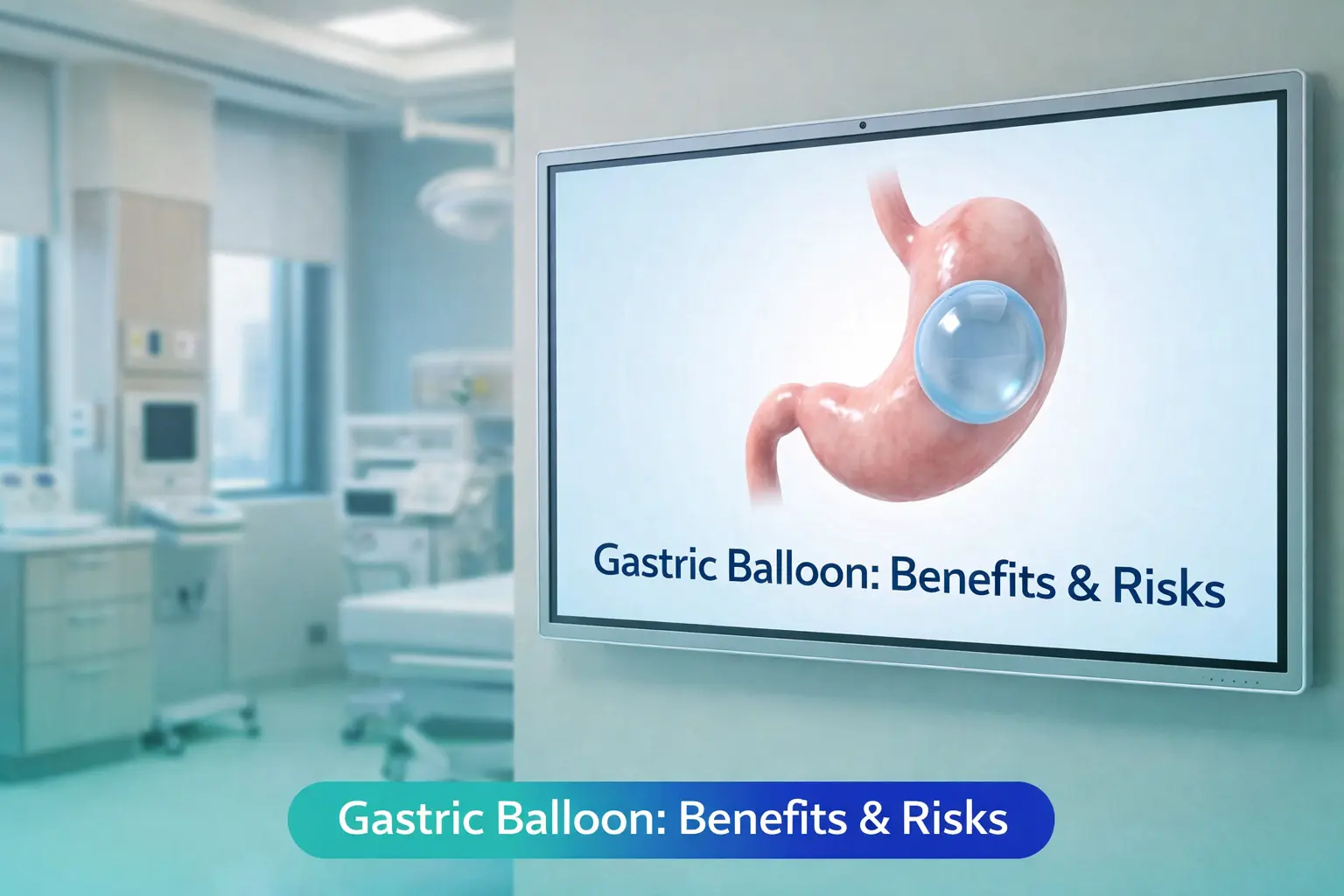 A medical image showing the insertion of a gastric balloon using an endoscope into the stomach, where it is filled with liquid or air to reduce the size of the stomach and help in feeling full and supporting gradual and safe weight loss.