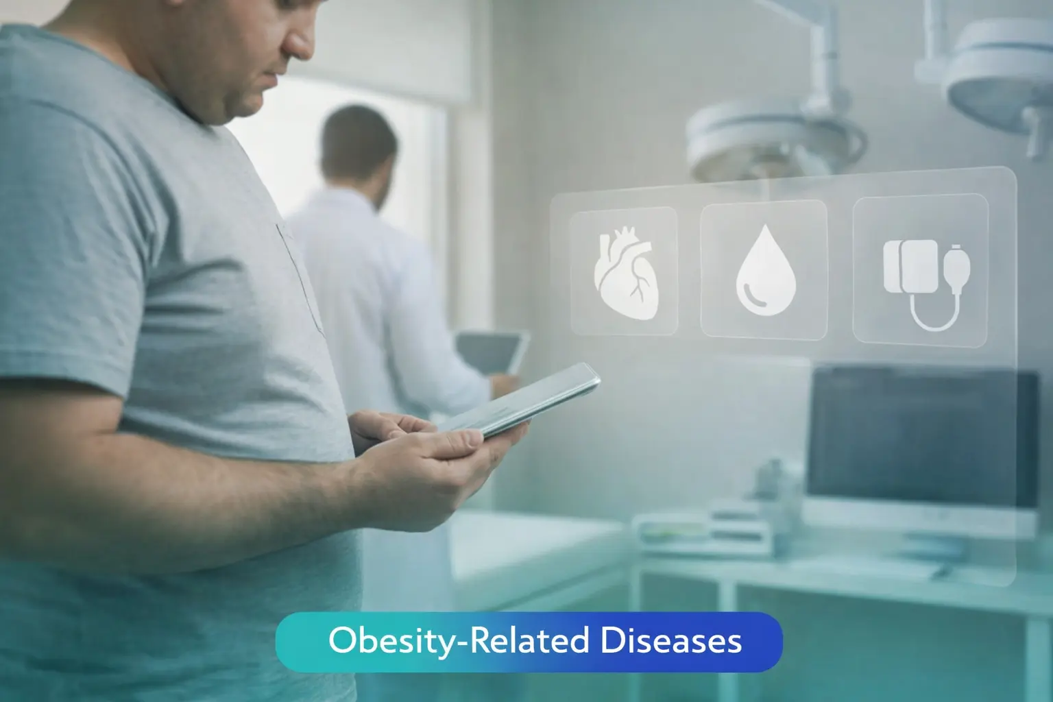 An illustration explaining the effect of obesity on different body systems such as the heart, liver, respiratory system and joints, and highlighting the relationship between weight gain and an increased risk of chronic diseases.